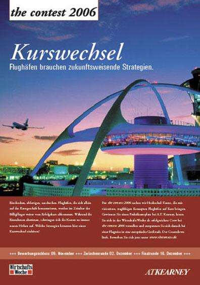 Die Unternehmensberatung A.T. Kearney veranstaltet gemeinsam mit der Wirtschaftswoche alljährlich einen Contest für Hochschul-Teams. Ein Plakat und ein Flyer sollen der Zielgruppe Studenten die Attraktivität des Wettberwerbs und der Veranstalter nahebringen und zur Teilnahme motivieren.