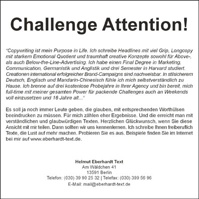 ... und sagt: "Herr Doktor, ich bin fix und fertig. Da sehe ich es als meine Berufung an, die deutsche Sprache wirkungsvoll einzusetzen, und andere verdienen einen Haufen Geld mit Slogans wie 'It’s your Heimspiel' oder 'Flavoured with dragonfruit'." "Ach was", meint der Doktor, "Don’t worry, be happy". |